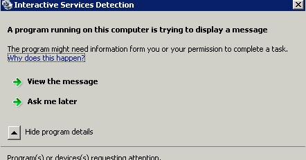 In the new Windows 2008 server, the service may not start properly if the server tries to load the Console. You'll get an "Interactive Services Detection" message if the Domino server or the Controller has a message to display. The screen looks like this: